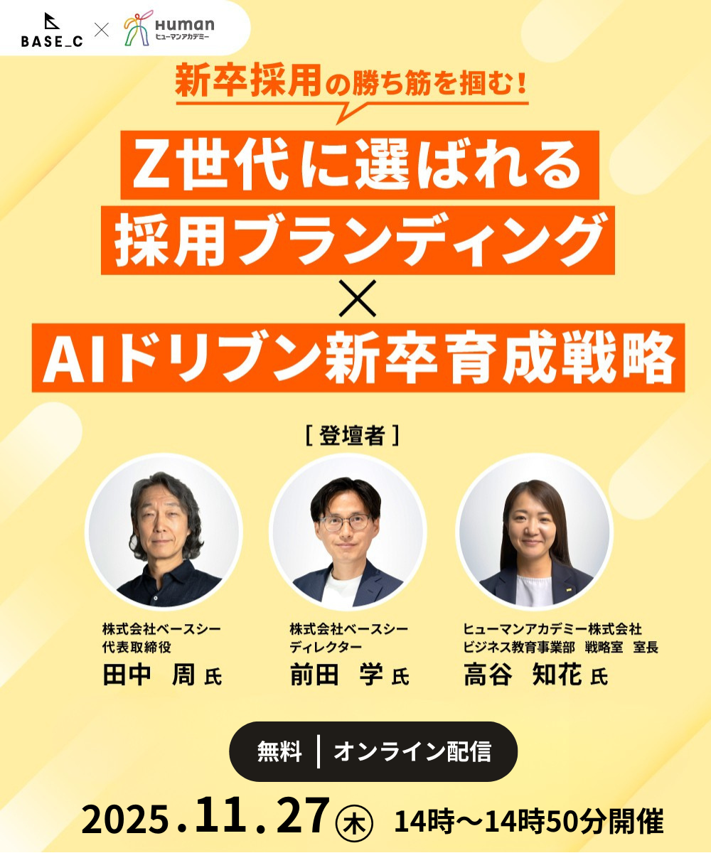 株式会社ベースシー 登壇者:田中周 氏 代表取締役 30年以上にわたり大手通販会社のプロモーション戦略やクリエイティブ制作に関わる。また、大学広報・募集戦略についても20年以上の経験を持つ。商品、サービスはもちろん、企業が持つ本質的な価値や魅力を見つけ出し、ビジュアル化、言語化することで人のキモチと行動を動かすクリエイティブを得意とする。 登壇者:前田学 氏 ディレクター 多くの企業や大学のブランディング、プロモーション支援の経験を持つ。中でもZ世代にアプローチするトレンドを反映したコミュニケーション設計やビジュアル制作を得意にしている。今までの豊富な経験と実績を活かし、企業と学生をつなぐ採用コンテンツの支援を行っている。全日本DM大賞受賞歴あり。