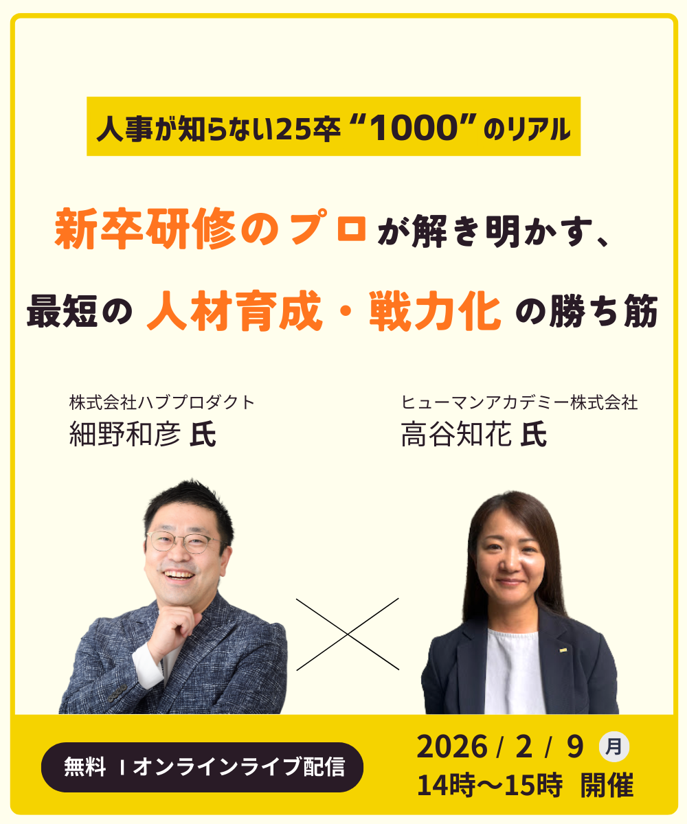 そこで本セミナーでは、具体的な仕組みの解説とともに、普段は「聞きたくても聞けない新卒の本音」をリアルに紐解いていきます。 現場のリアルな声を反映させた、明日から機能する育成メソッドをお持ち帰りください。
